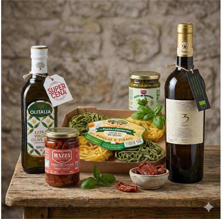 Uživajte u bogatstvu autentičnih mediteranskih ukusa uz pažljivo odabran set delikatesa. U setu se nalaze: vrhunsko maslinovo ulje, s pažnjom pasta, aromatični pesto sos, paradajz sušen na suncu i elegantno belo vino koje savršeno zaokružuje doživljaj. Idealan poklon za prave gurmane, ljubitelje italijanske kuhinje i sve one koji znaju da uživaju u vrhunskom zalogaju i čaši vina.